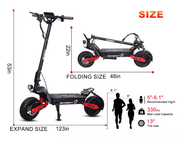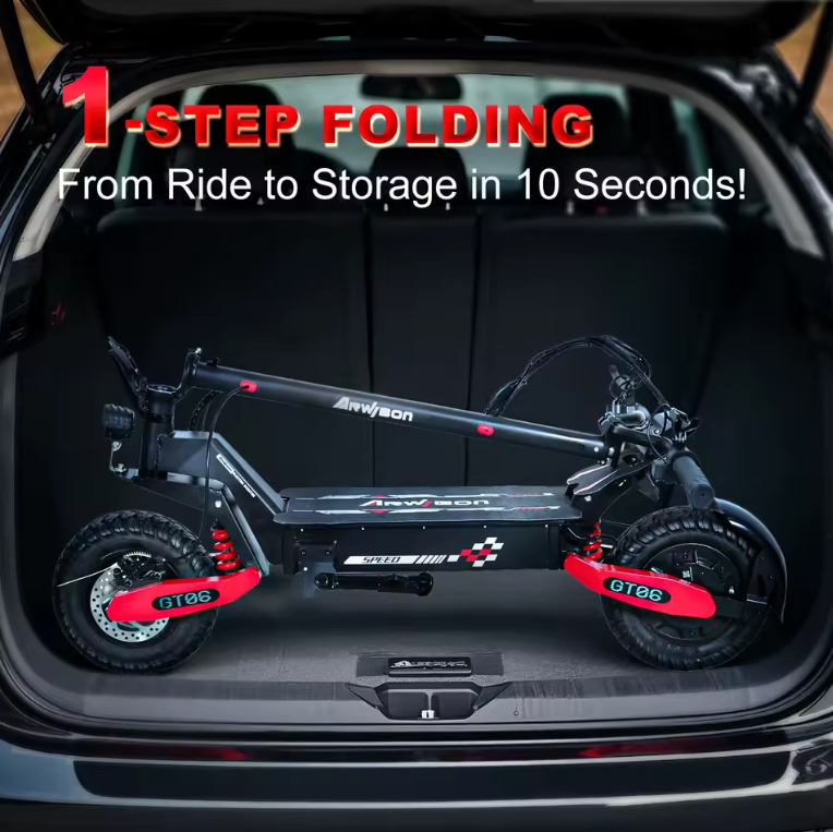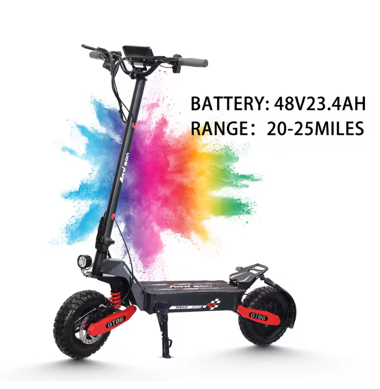 The Arwibon GT06 1200W Foldable E-Scooter combines speed, power, and convenience. With a top speed of 30 mph and a 15-20 mile range, it’s perfect for quick commutes or leisurely rides. Its quality suspension and disc brakes ensure a smooth, safe experience, while the foldable design makes it easy to carry and store. Enjoy a reliable and thrilling ride wherever you go.